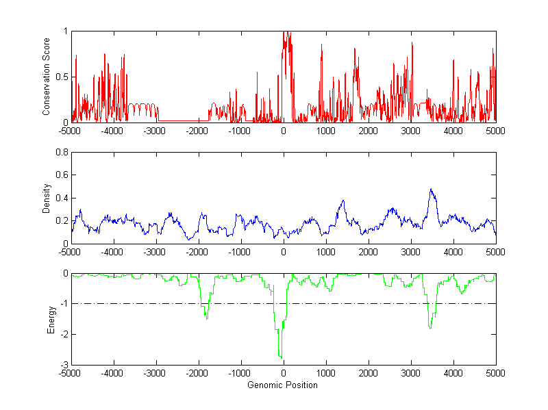 The energy profile (green curve) is about energy for module detection based on TF interaction. The positions with energy less than -1 indicate the existence of CRMs.