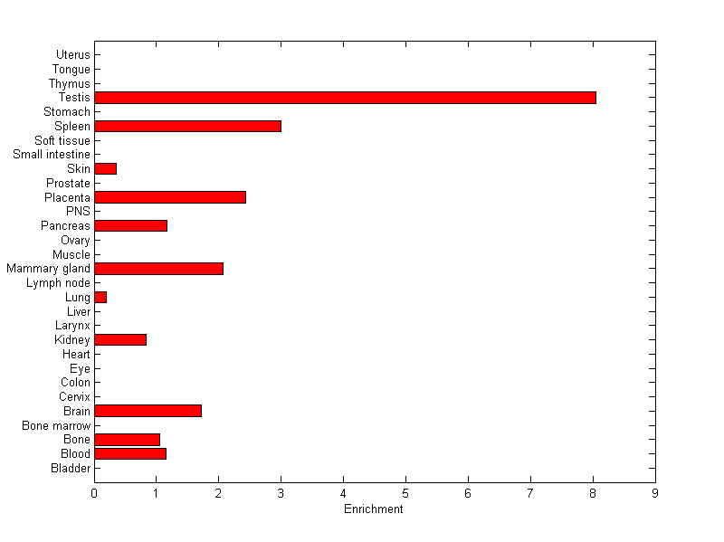 The expression level is normalized with tissue-library size. Each value for a gene in a tissue is a ratio of observed ESTs to the expected one in this tissue. The expected number of ESTs is the product of total ESTs of the gene and the fraction of total ESTs in the tissue among all ESTs in 30 tissues.