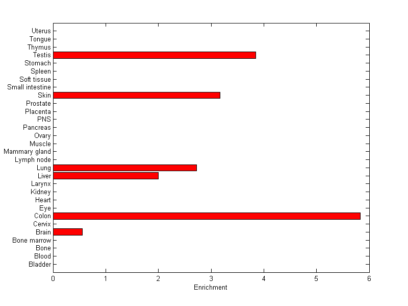 The expression level is normalized with tissue-library size. Each value for a gene in a tissue is a ratio of observed ESTs to the expected one in this tissue. The expected number of ESTs is the product of total ESTs of the gene and the fraction of total ESTs in the tissue among all ESTs in 30 tissues.