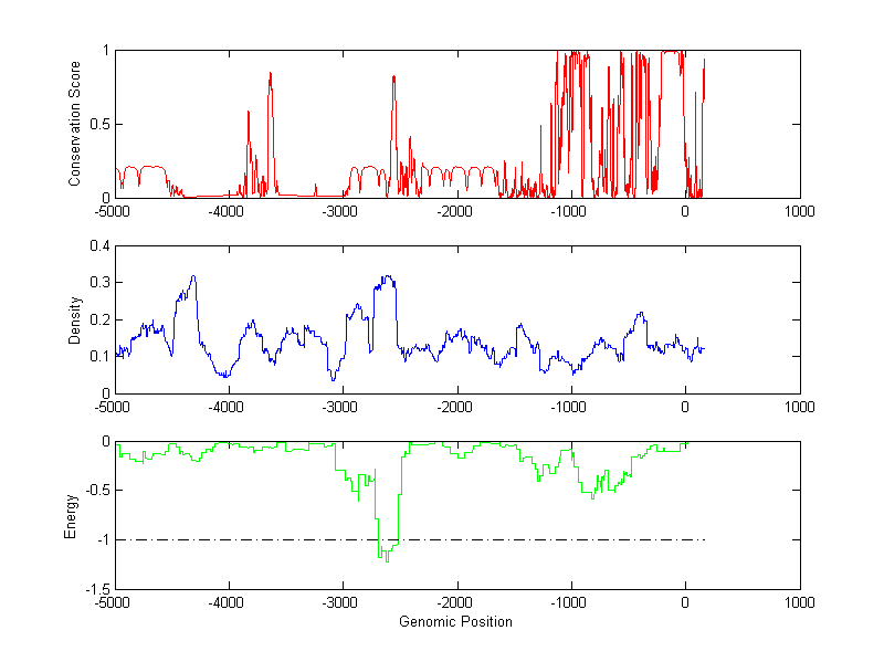 The energy profile (green curve) is about energy for module detection based on TF interaction. The positions with energy less than -1 indicate the existence of CRMs.