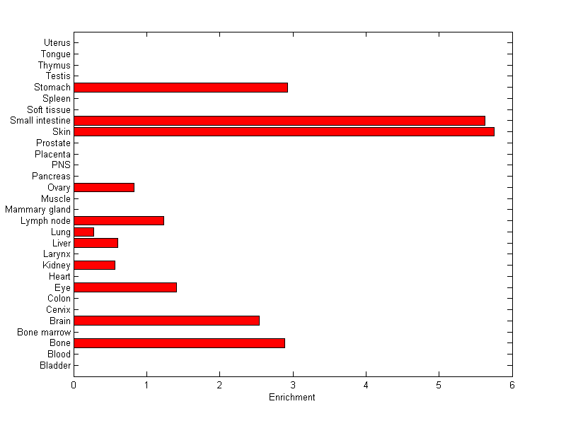 The expression level is normalized with tissue-library size. Each value for a gene in a tissue is a ratio of observed ESTs to the expected one in this tissue. The expected number of ESTs is the product of total ESTs of the gene and the fraction of total ESTs in the tissue among all ESTs in 30 tissues.