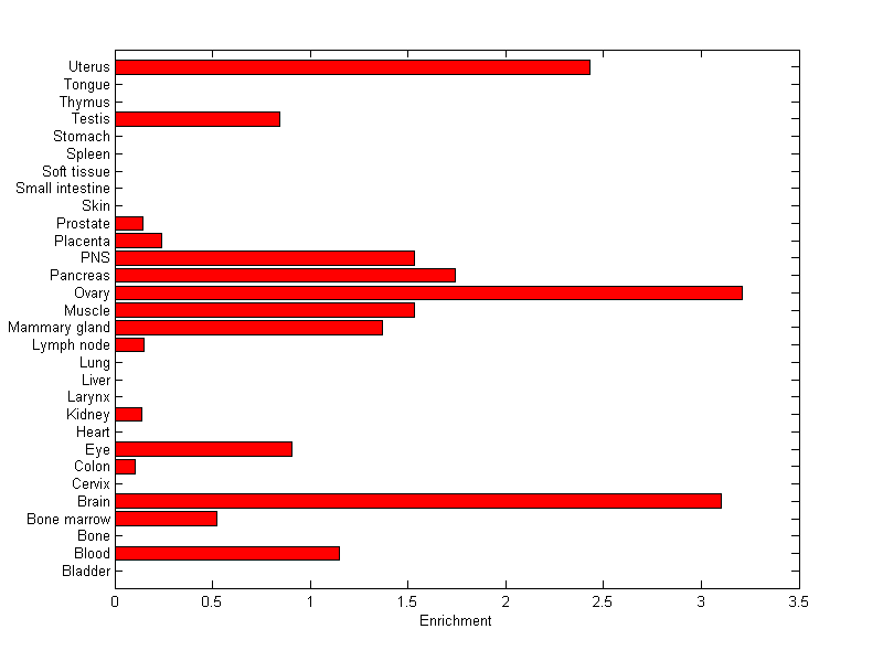 The expression level is normalized with tissue-library size. Each value for a gene in a tissue is a ratio of observed ESTs to the expected one in this tissue. The expected number of ESTs is the product of total ESTs of the gene and the fraction of total ESTs in the tissue among all ESTs in 30 tissues.
