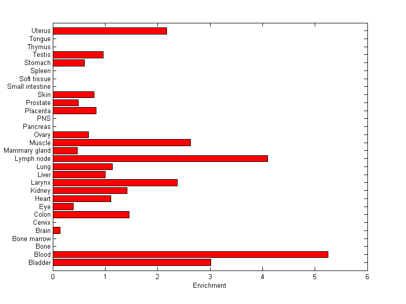 The expression level is normalized with tissue-library size. Each value for a gene in a tissue is a ratio of observed ESTs to the expected one in this tissue. The expected number of ESTs is the product of total ESTs of the gene and the fraction of total ESTs in the tissue among all ESTs in 30 tissues.