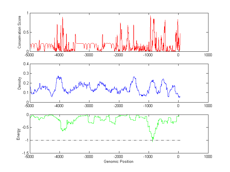 The energy profile (green curve) is about energy for module detection based on TF interaction. The positions with energy less than -1 indicate the existence of CRMs.