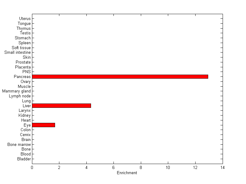 The expression level is normalized with tissue-library size. Each value for a gene in a tissue is a ratio of observed ESTs to the expected one in this tissue. The expected number of ESTs is the product of total ESTs of the gene and the fraction of total ESTs in the tissue among all ESTs in 30 tissues.