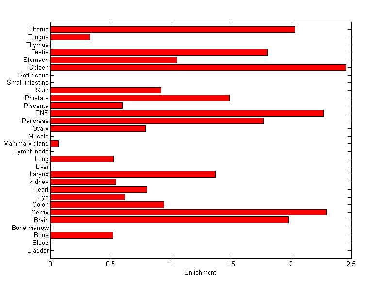 The expression level is normalized with tissue-library size. Each value for a gene in a tissue is a ratio of observed ESTs to the expected one in this tissue. The expected number of ESTs is the product of total ESTs of the gene and the fraction of total ESTs in the tissue among all ESTs in 30 tissues.