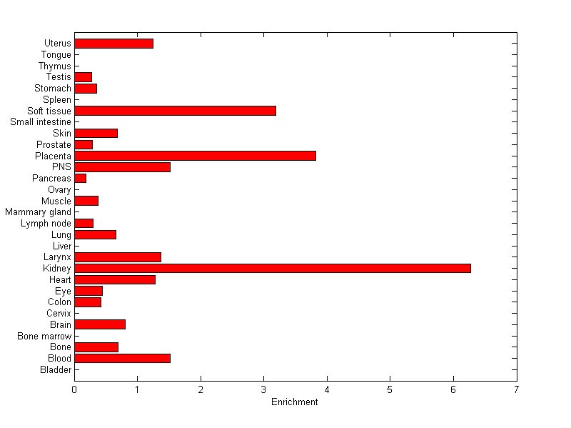 The expression level is normalized with tissue-library size. Each value for a gene in a tissue is a ratio of observed ESTs to the expected one in this tissue. The expected number of ESTs is the product of total ESTs of the gene and the fraction of total ESTs in the tissue among all ESTs in 30 tissues.
