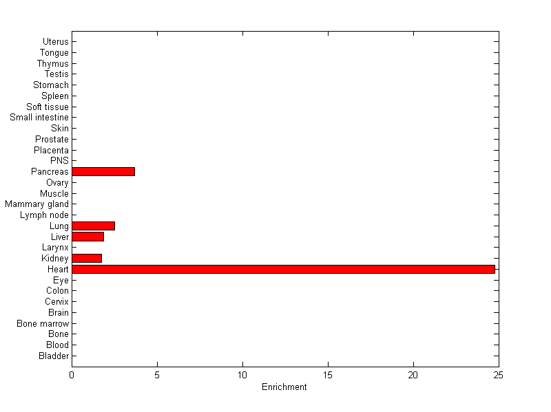 The expression level is normalized with tissue-library size. Each value for a gene in a tissue is a ratio of observed ESTs to the expected one in this tissue. The expected number of ESTs is the product of total ESTs of the gene and the fraction of total ESTs in the tissue among all ESTs in 30 tissues.