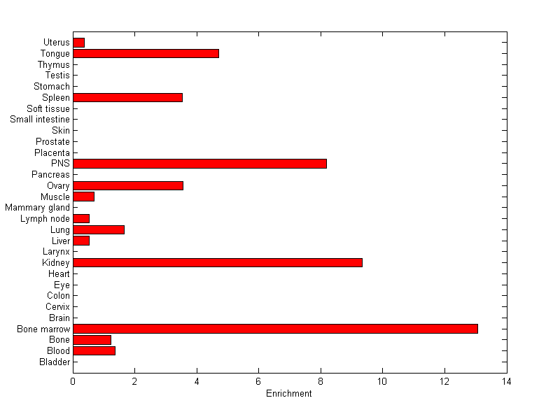 About the profile: The expression level is normalized with tissue-library size. Each value for a gene in a tissue is a ratio of observed ESTs to the expected one in this tissue. The expected number of ESTs is the product of total ESTs of the gene and the fraction of total ESTs in the tissue among all ESTs in 30 tissues. Summary: This gene is preferentially expressed in [bone_marrow, kidney] Download: |