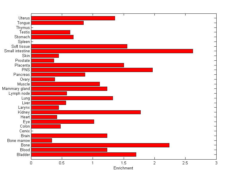 The expression level is normalized with tissue-library size. Each value for a gene in a tissue is a ratio of observed ESTs to the expected one in this tissue. The expected number of ESTs is the product of total ESTs of the gene and the fraction of total ESTs in the tissue among all ESTs in 30 tissues.