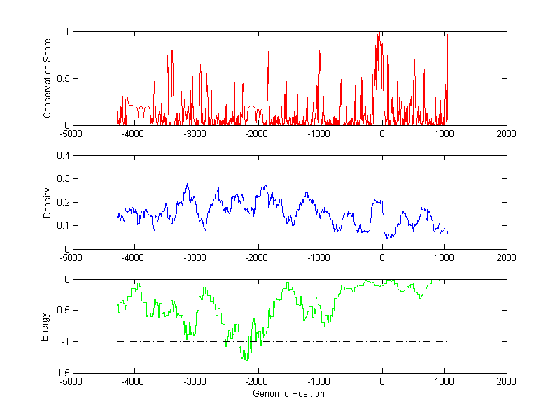 About the profiles: The conservation profile (red curve) is about conservation scores of the promoter sequences. Conservation was determined from an eight-way alignment of human, chimpanzee, dog, mouse, rat, chicken, zebrafish and fugu sequences. The conservation was quantified by a conservation score between 0 and 1, with 1 as highest conservation. The conservation score was obtained from UCSC genome databases. The density profile (blue curve) is about density of all TF binding sites. The energy profile (green curve) is about energy for module detection based on TF interaction. The positions with energy less than -1 indicate the existence of CRMs. Download: Conservation profileDensity profile Energy profile CRM summary |