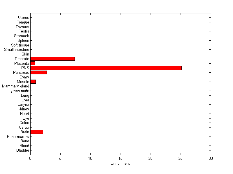 About the profile: The expression level is normalized with tissue-library size. Each value for a gene in a tissue is a ratio of observed ESTs to the expected one in this tissue. The expected number of ESTs is the product of total ESTs of the gene and the fraction of total ESTs in the tissue among all ESTs in 30 tissues. Summary: This gene is preferentially expressed in [peripheral_nervous_system, prostate] Download: |