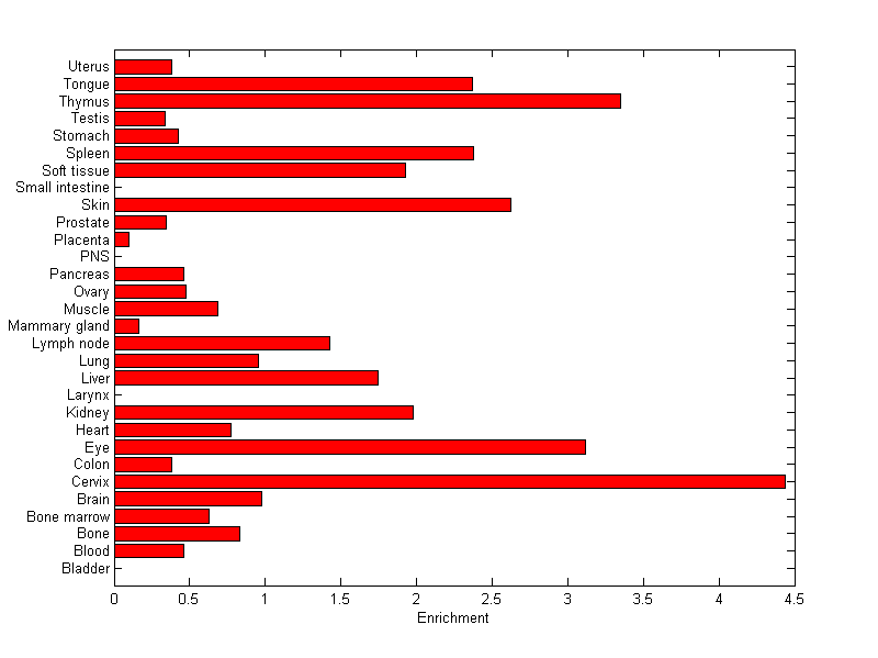 The expression level is normalized with tissue-library size. Each value for a gene in a tissue is a ratio of observed ESTs to the expected one in this tissue. The expected number of ESTs is the product of total ESTs of the gene and the fraction of total ESTs in the tissue among all ESTs in 30 tissues.