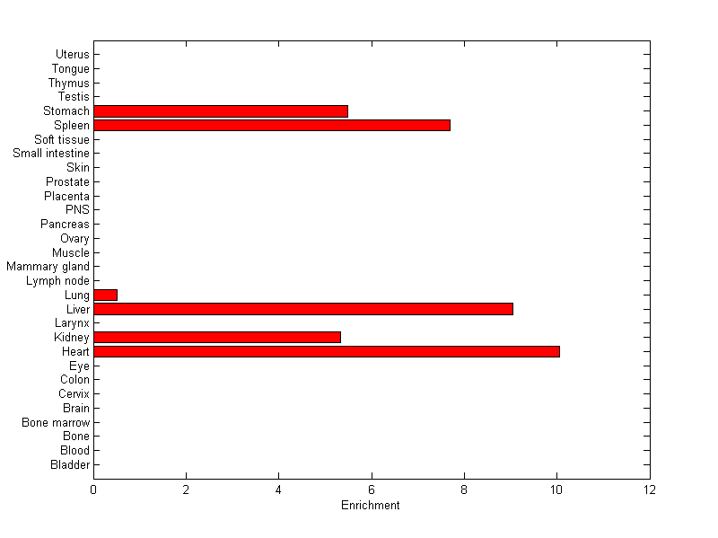 The expression level is normalized with tissue-library size. Each value for a gene in a tissue is a ratio of observed ESTs to the expected one in this tissue. The expected number of ESTs is the product of total ESTs of the gene and the fraction of total ESTs in the tissue among all ESTs in 30 tissues.