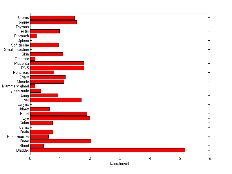 The expression level is normalized with tissue-library size. Each value for a gene in a tissue is a ratio of observed ESTs to the expected one in this tissue. The expected number of ESTs is the product of total ESTs of the gene and the fraction of total ESTs in the tissue among all ESTs in 30 tissues.