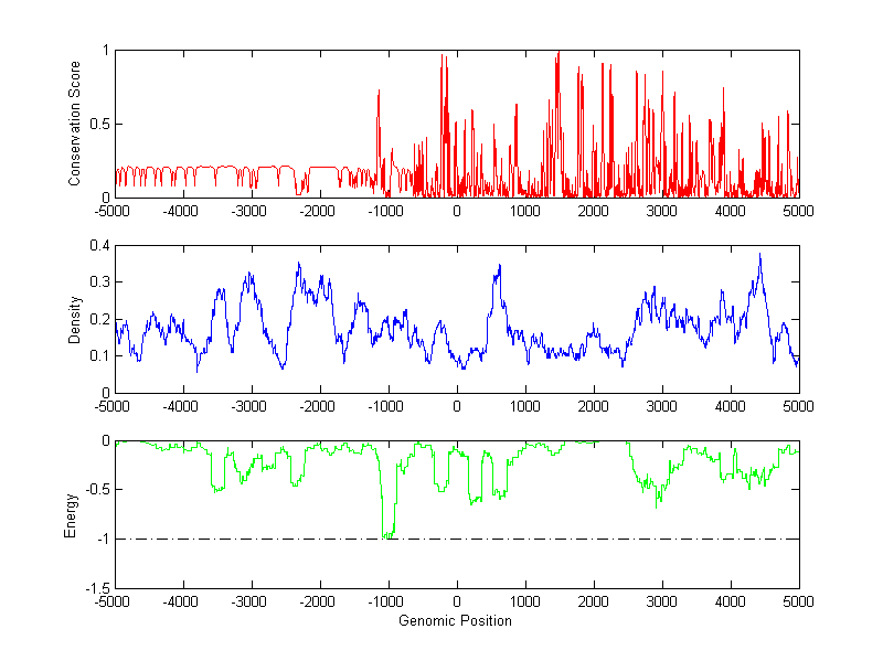 The energy profile (green curve) is about energy for module detection based on TF interaction. The positions with energy less than -1 indicate the existence of CRMs.