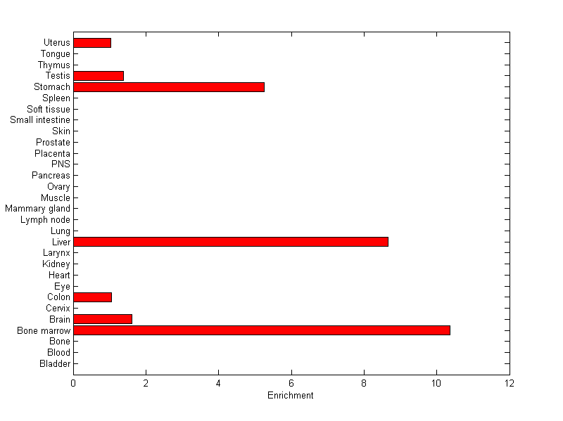 The expression level is normalized with tissue-library size. Each value for a gene in a tissue is a ratio of observed ESTs to the expected one in this tissue. The expected number of ESTs is the product of total ESTs of the gene and the fraction of total ESTs in the tissue among all ESTs in 30 tissues.