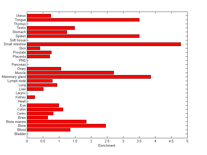 The expression level is normalized with tissue-library size. Each value for a gene in a tissue is a ratio of observed ESTs to the expected one in this tissue. The expected number of ESTs is the product of total ESTs of the gene and the fraction of total ESTs in the tissue among all ESTs in 30 tissues.