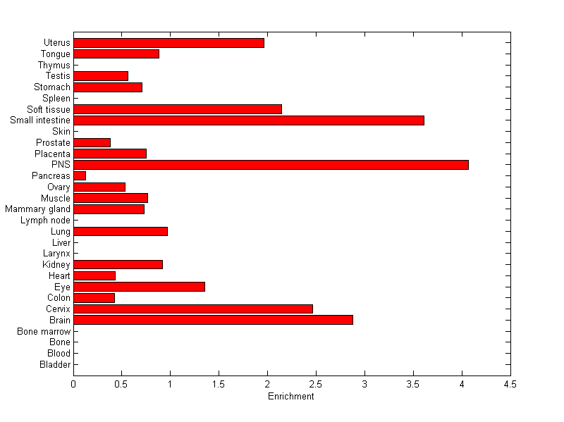 The expression level is normalized with tissue-library size. Each value for a gene in a tissue is a ratio of observed ESTs to the expected one in this tissue. The expected number of ESTs is the product of total ESTs of the gene and the fraction of total ESTs in the tissue among all ESTs in 30 tissues.