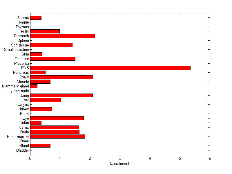 The expression level is normalized with tissue-library size. Each value for a gene in a tissue is a ratio of observed ESTs to the expected one in this tissue. The expected number of ESTs is the product of total ESTs of the gene and the fraction of total ESTs in the tissue among all ESTs in 30 tissues.