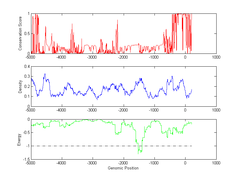 The energy profile (green curve) is about energy for module detection based on TF interaction. The positions with energy less than -1 indicate the existence of CRMs.