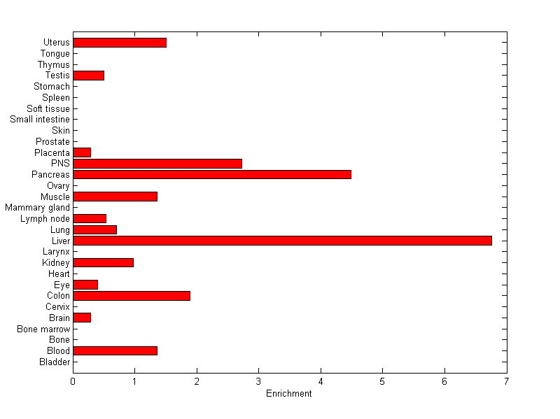 The expression level is normalized with tissue-library size. Each value for a gene in a tissue is a ratio of observed ESTs to the expected one in this tissue. The expected number of ESTs is the product of total ESTs of the gene and the fraction of total ESTs in the tissue among all ESTs in 30 tissues.