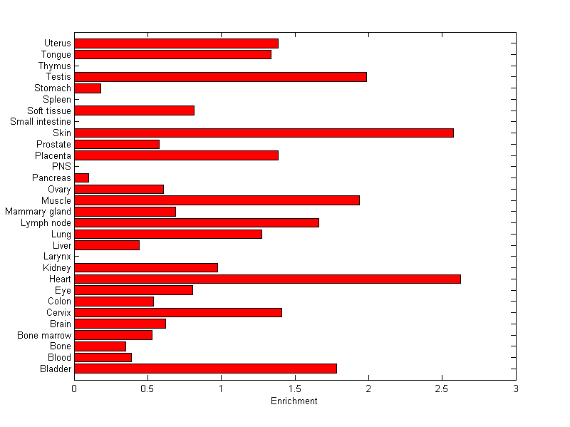 The expression level is normalized with tissue-library size. Each value for a gene in a tissue is a ratio of observed ESTs to the expected one in this tissue. The expected number of ESTs is the product of total ESTs of the gene and the fraction of total ESTs in the tissue among all ESTs in 30 tissues.