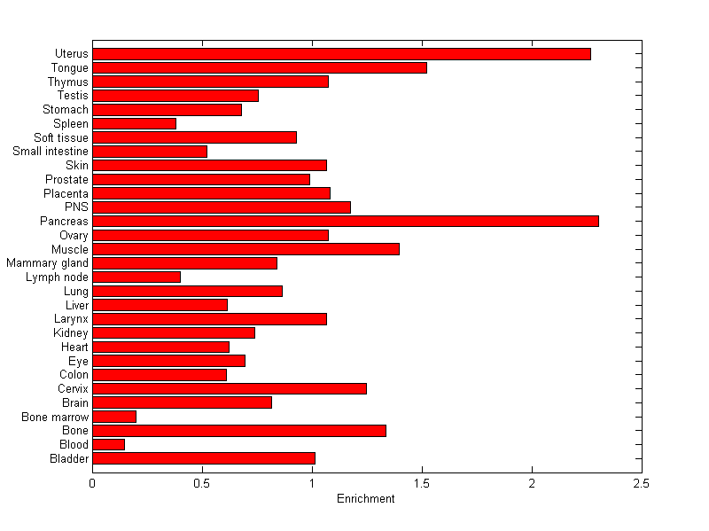 The expression level is normalized with tissue-library size. Each value for a gene in a tissue is a ratio of observed ESTs to the expected one in this tissue. The expected number of ESTs is the product of total ESTs of the gene and the fraction of total ESTs in the tissue among all ESTs in 30 tissues.