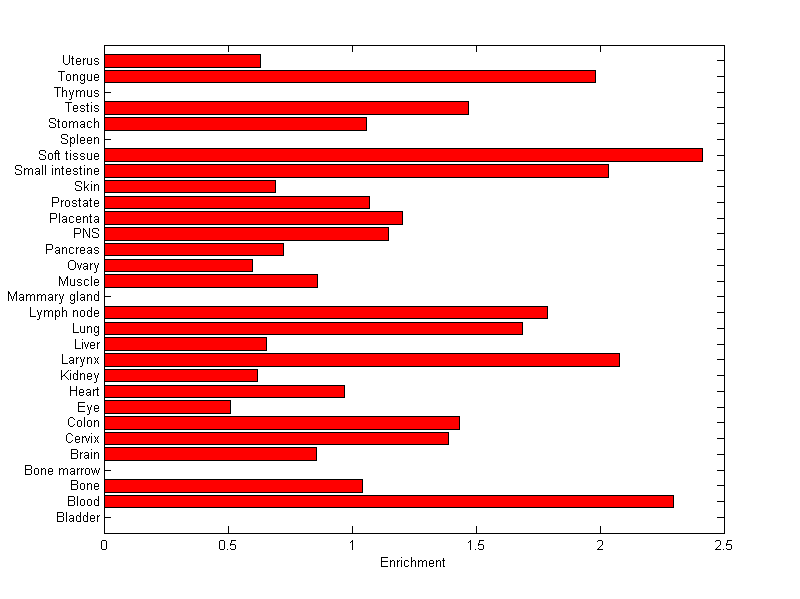 The expression level is normalized with tissue-library size. Each value for a gene in a tissue is a ratio of observed ESTs to the expected one in this tissue. The expected number of ESTs is the product of total ESTs of the gene and the fraction of total ESTs in the tissue among all ESTs in 30 tissues.