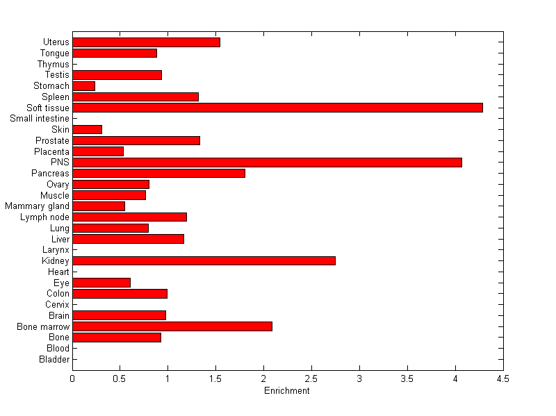 The expression level is normalized with tissue-library size. Each value for a gene in a tissue is a ratio of observed ESTs to the expected one in this tissue. The expected number of ESTs is the product of total ESTs of the gene and the fraction of total ESTs in the tissue among all ESTs in 30 tissues.