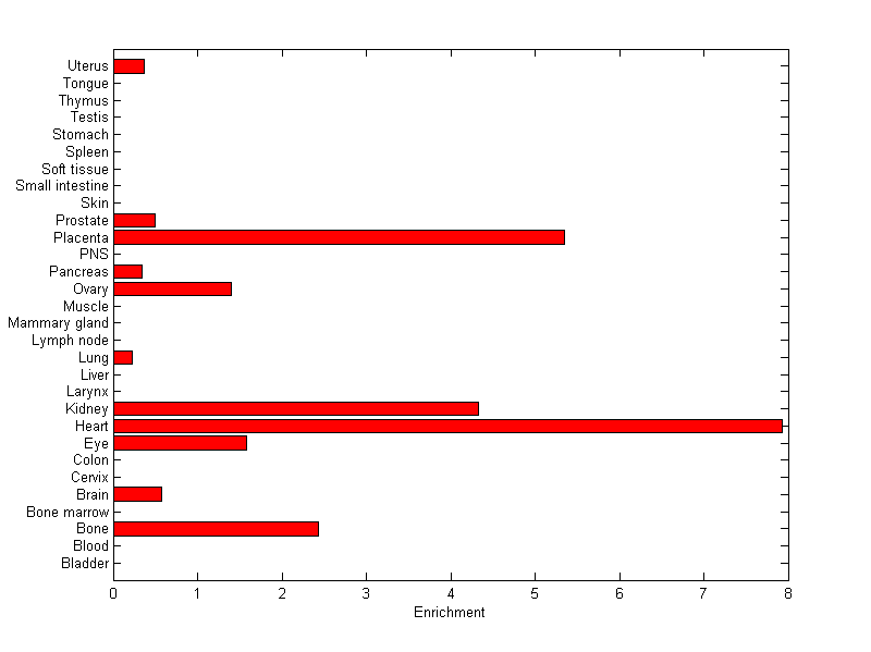 About the profile: The expression level is normalized with tissue-library size. Each value for a gene in a tissue is a ratio of observed ESTs to the expected one in this tissue. The expected number of ESTs is the product of total ESTs of the gene and the fraction of total ESTs in the tissue among all ESTs in 30 tissues. Summary: This gene is preferentially expressed in [heart, placenta] Download: |