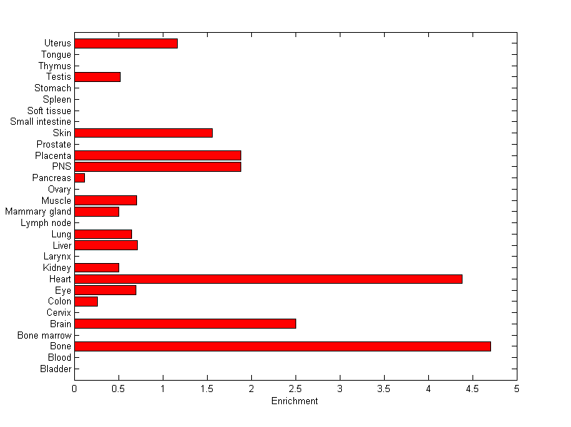 The expression level is normalized with tissue-library size. Each value for a gene in a tissue is a ratio of observed ESTs to the expected one in this tissue. The expected number of ESTs is the product of total ESTs of the gene and the fraction of total ESTs in the tissue among all ESTs in 30 tissues.