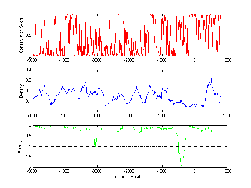 The energy profile (green curve) is about energy for module detection based on TF interaction. The positions with energy less than -1 indicate the existence of CRMs.