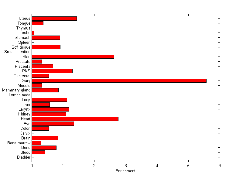 The expression level is normalized with tissue-library size. Each value for a gene in a tissue is a ratio of observed ESTs to the expected one in this tissue. The expected number of ESTs is the product of total ESTs of the gene and the fraction of total ESTs in the tissue among all ESTs in 30 tissues.