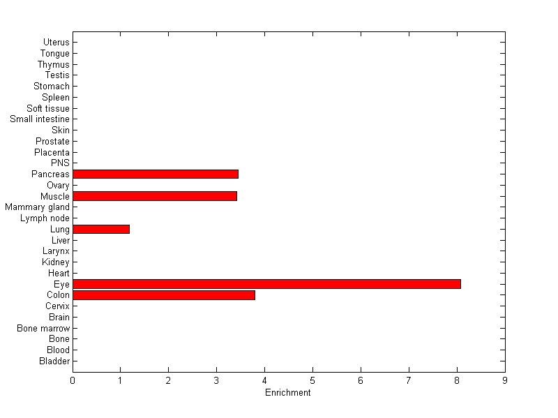 The expression level is normalized with tissue-library size. Each value for a gene in a tissue is a ratio of observed ESTs to the expected one in this tissue. The expected number of ESTs is the product of total ESTs of the gene and the fraction of total ESTs in the tissue among all ESTs in 30 tissues.