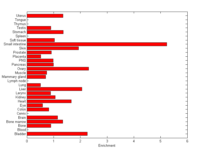 The expression level is normalized with tissue-library size. Each value for a gene in a tissue is a ratio of observed ESTs to the expected one in this tissue. The expected number of ESTs is the product of total ESTs of the gene and the fraction of total ESTs in the tissue among all ESTs in 30 tissues.