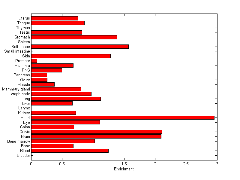 The expression level is normalized with tissue-library size. Each value for a gene in a tissue is a ratio of observed ESTs to the expected one in this tissue. The expected number of ESTs is the product of total ESTs of the gene and the fraction of total ESTs in the tissue among all ESTs in 30 tissues.