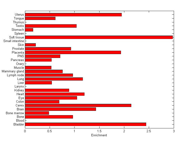 The expression level is normalized with tissue-library size. Each value for a gene in a tissue is a ratio of observed ESTs to the expected one in this tissue. The expected number of ESTs is the product of total ESTs of the gene and the fraction of total ESTs in the tissue among all ESTs in 30 tissues.