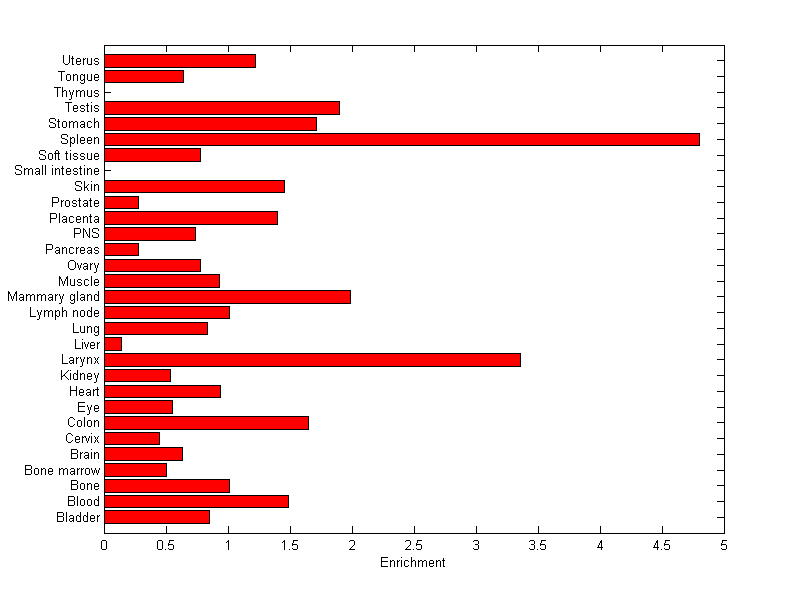 The expression level is normalized with tissue-library size. Each value for a gene in a tissue is a ratio of observed ESTs to the expected one in this tissue. The expected number of ESTs is the product of total ESTs of the gene and the fraction of total ESTs in the tissue among all ESTs in 30 tissues.