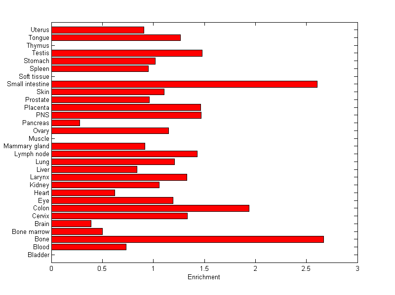 The expression level is normalized with tissue-library size. Each value for a gene in a tissue is a ratio of observed ESTs to the expected one in this tissue. The expected number of ESTs is the product of total ESTs of the gene and the fraction of total ESTs in the tissue among all ESTs in 30 tissues.