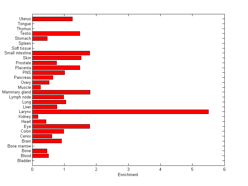 The expression level is normalized with tissue-library size. Each value for a gene in a tissue is a ratio of observed ESTs to the expected one in this tissue. The expected number of ESTs is the product of total ESTs of the gene and the fraction of total ESTs in the tissue among all ESTs in 30 tissues.