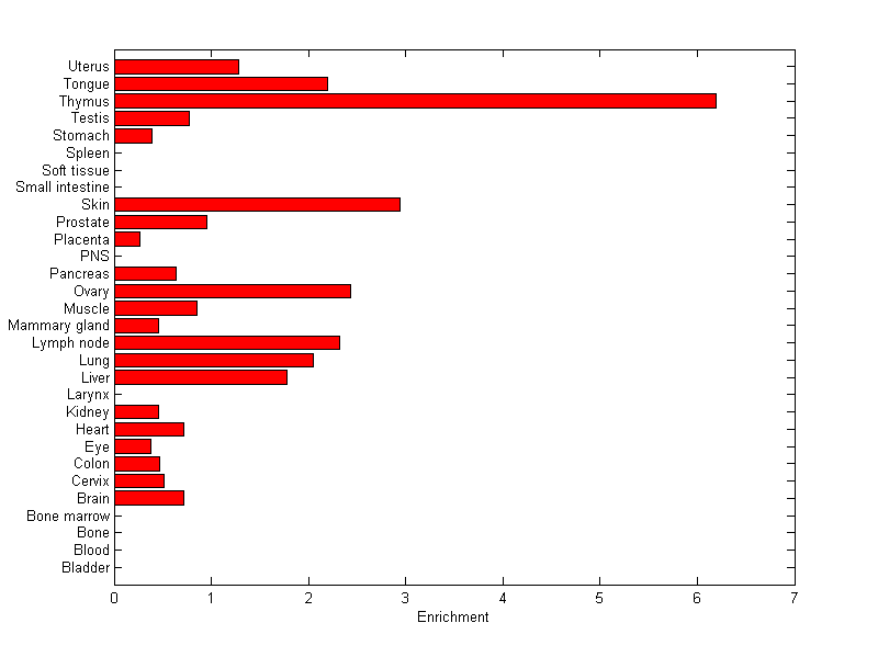 The expression level is normalized with tissue-library size. Each value for a gene in a tissue is a ratio of observed ESTs to the expected one in this tissue. The expected number of ESTs is the product of total ESTs of the gene and the fraction of total ESTs in the tissue among all ESTs in 30 tissues.