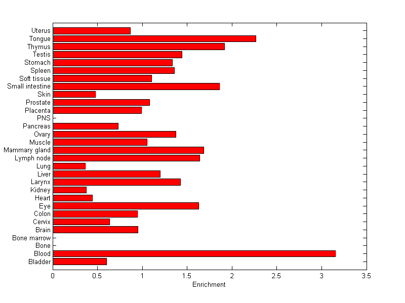 The expression level is normalized with tissue-library size. Each value for a gene in a tissue is a ratio of observed ESTs to the expected one in this tissue. The expected number of ESTs is the product of total ESTs of the gene and the fraction of total ESTs in the tissue among all ESTs in 30 tissues.
