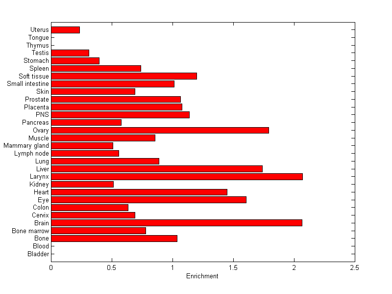 The expression level is normalized with tissue-library size. Each value for a gene in a tissue is a ratio of observed ESTs to the expected one in this tissue. The expected number of ESTs is the product of total ESTs of the gene and the fraction of total ESTs in the tissue among all ESTs in 30 tissues.