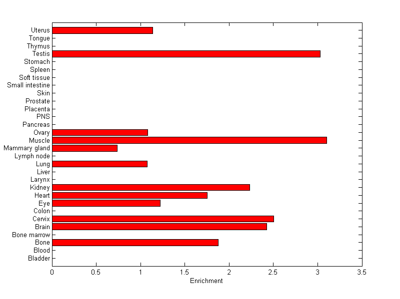 The expression level is normalized with tissue-library size. Each value for a gene in a tissue is a ratio of observed ESTs to the expected one in this tissue. The expected number of ESTs is the product of total ESTs of the gene and the fraction of total ESTs in the tissue among all ESTs in 30 tissues.