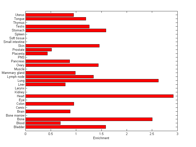 The expression level is normalized with tissue-library size. Each value for a gene in a tissue is a ratio of observed ESTs to the expected one in this tissue. The expected number of ESTs is the product of total ESTs of the gene and the fraction of total ESTs in the tissue among all ESTs in 30 tissues.
