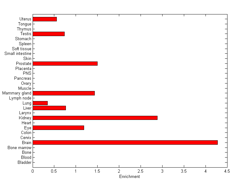 The expression level is normalized with tissue-library size. Each value for a gene in a tissue is a ratio of observed ESTs to the expected one in this tissue. The expected number of ESTs is the product of total ESTs of the gene and the fraction of total ESTs in the tissue among all ESTs in 30 tissues.