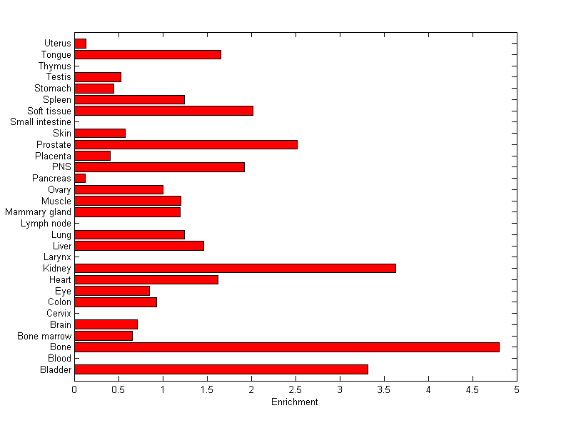 The expression level is normalized with tissue-library size. Each value for a gene in a tissue is a ratio of observed ESTs to the expected one in this tissue. The expected number of ESTs is the product of total ESTs of the gene and the fraction of total ESTs in the tissue among all ESTs in 30 tissues.