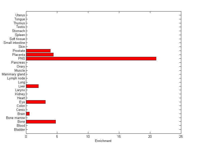 The expression level is normalized with tissue-library size. Each value for a gene in a tissue is a ratio of observed ESTs to the expected one in this tissue. The expected number of ESTs is the product of total ESTs of the gene and the fraction of total ESTs in the tissue among all ESTs in 30 tissues.