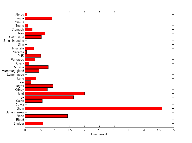 The expression level is normalized with tissue-library size. Each value for a gene in a tissue is a ratio of observed ESTs to the expected one in this tissue. The expected number of ESTs is the product of total ESTs of the gene and the fraction of total ESTs in the tissue among all ESTs in 30 tissues.
